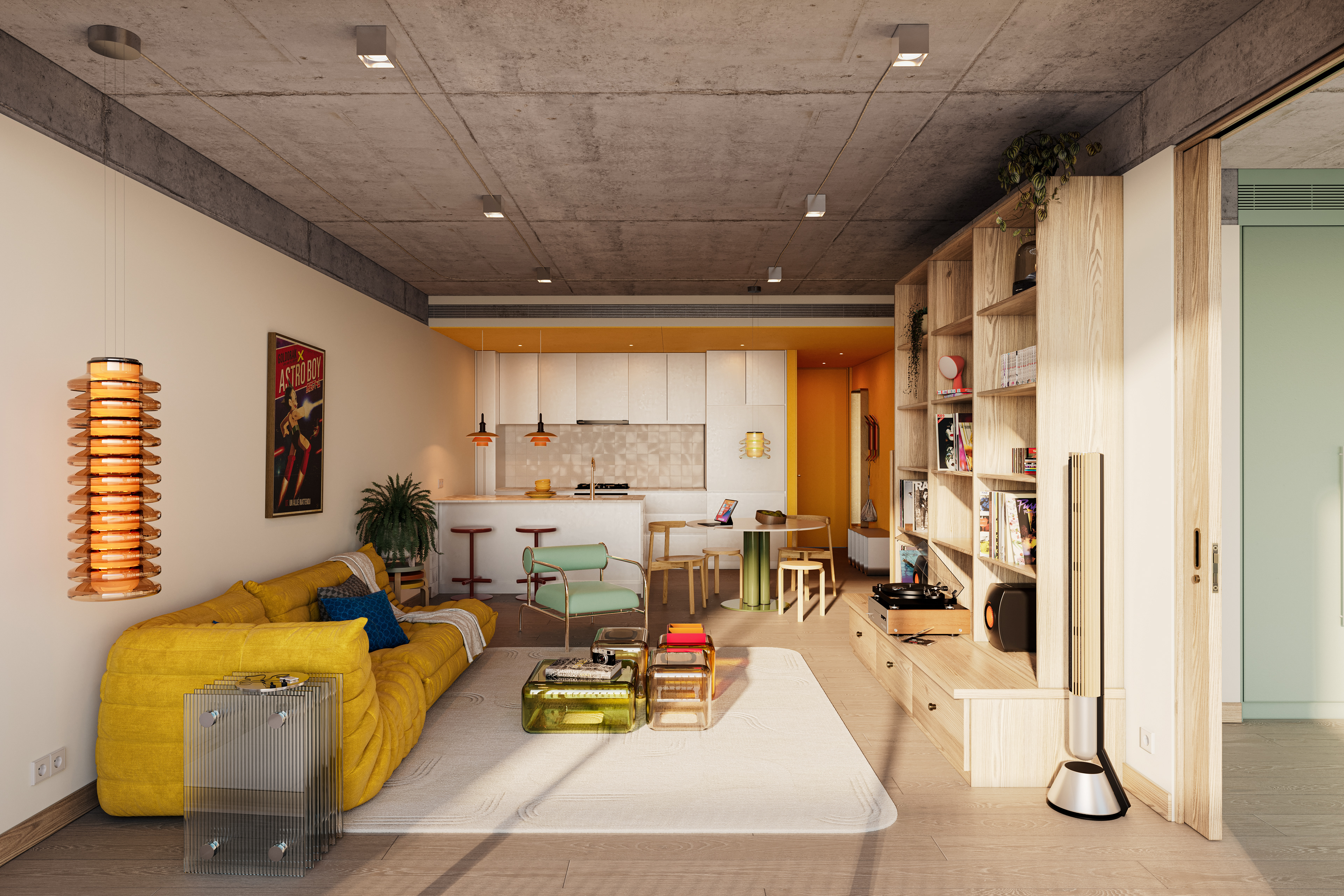 This project was developed for an archviz competition, with the goal of creating a nostalgic interior inspired by the concept of vintage futurism: bold yet balanced colors, textures that invite touch, and references to music, analog technology, and pop culture.