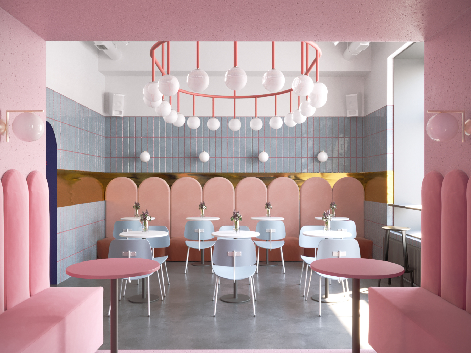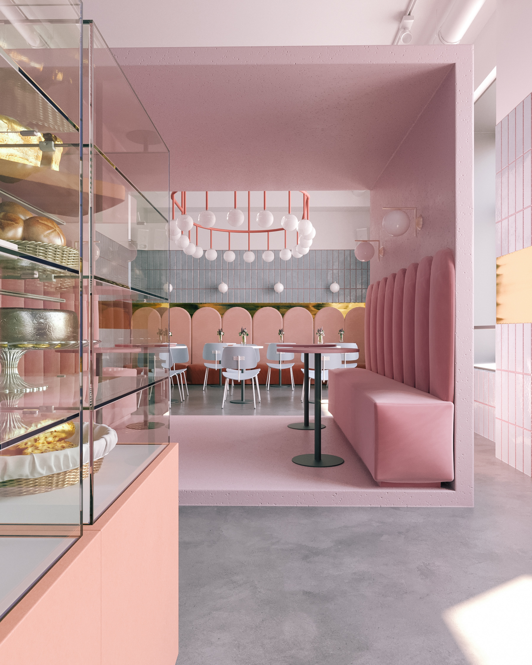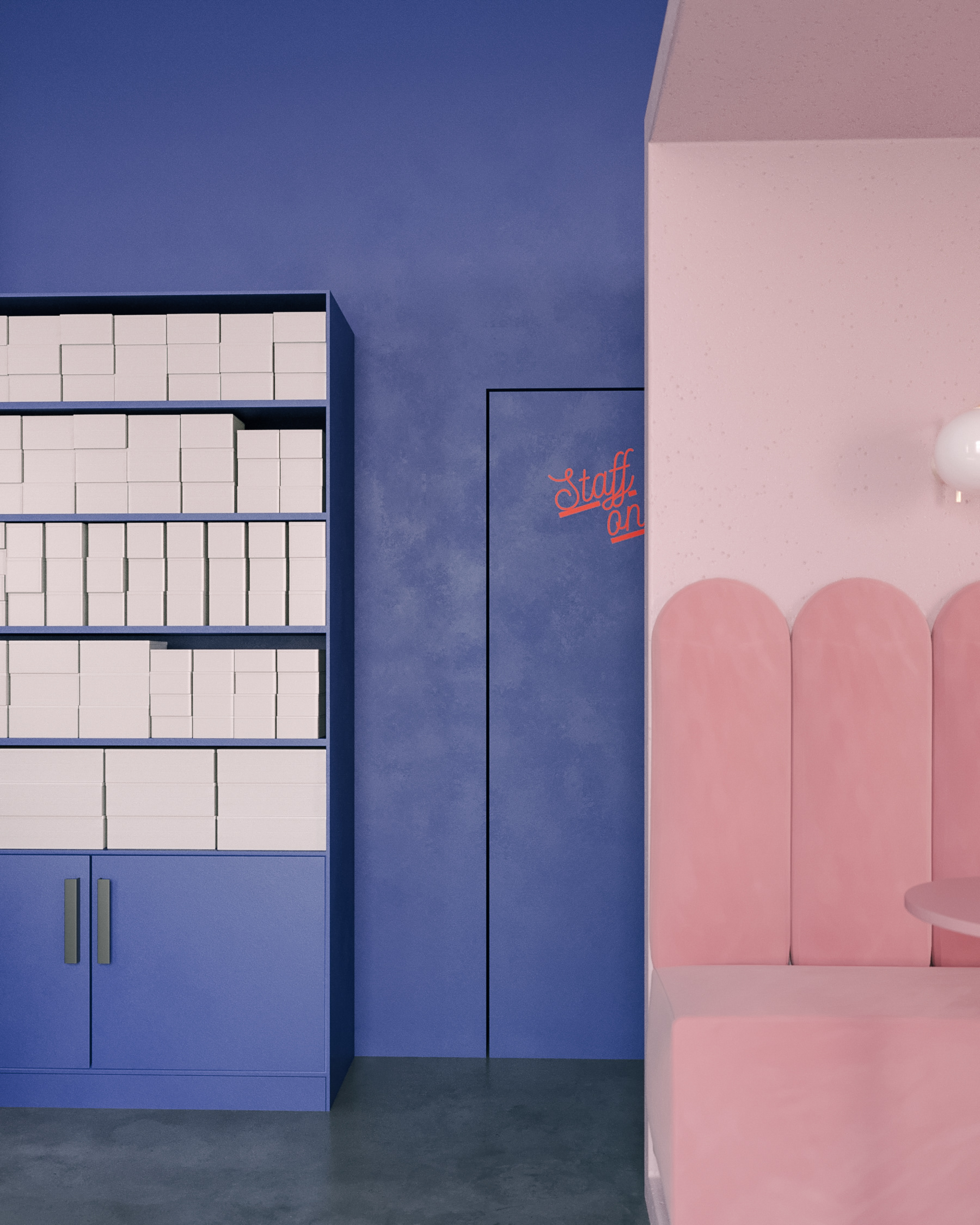 Space is divided into three parts according to their function. A deep-blue take-away zone, a waiting zone which is located in the center of space in a pink box designed specially for this task, and light-grey zone, where you can stay for a croissant with a cup of cappuccino.