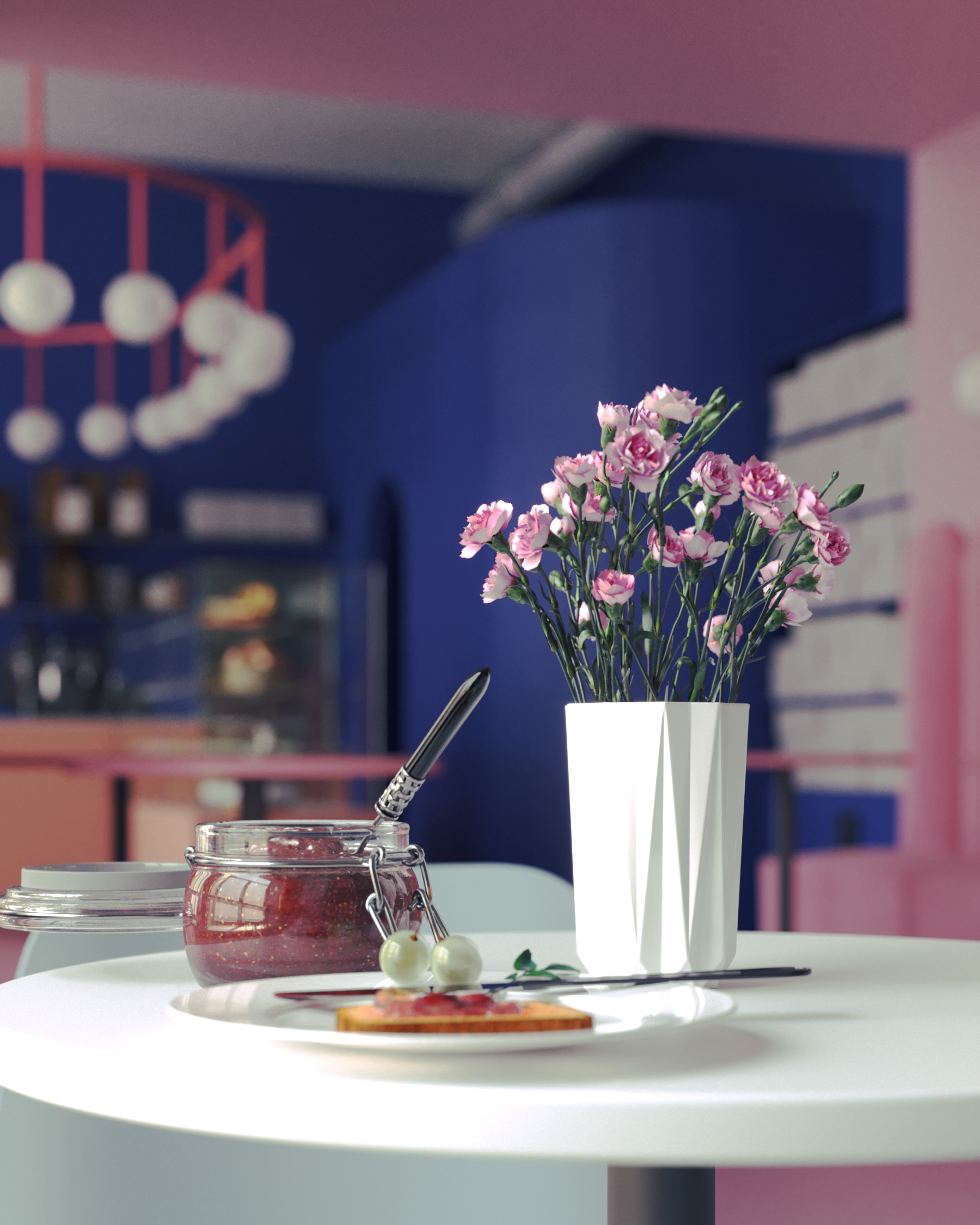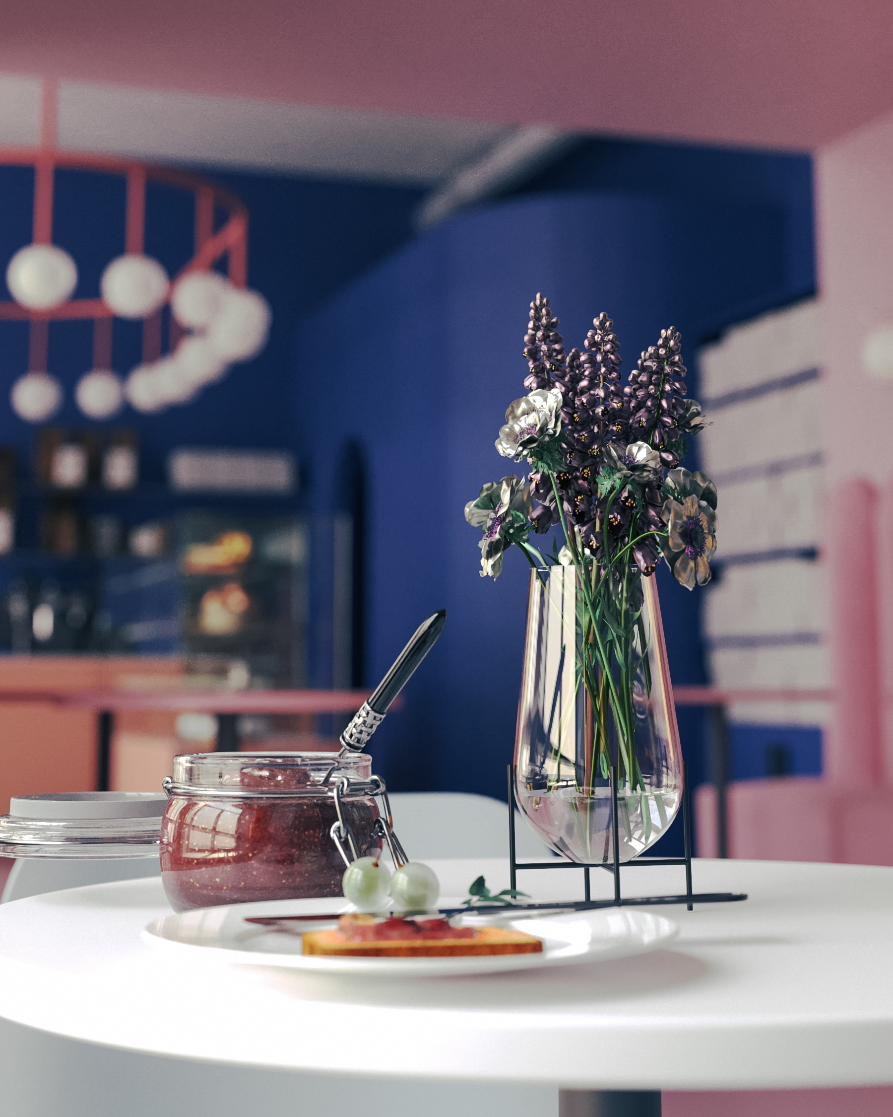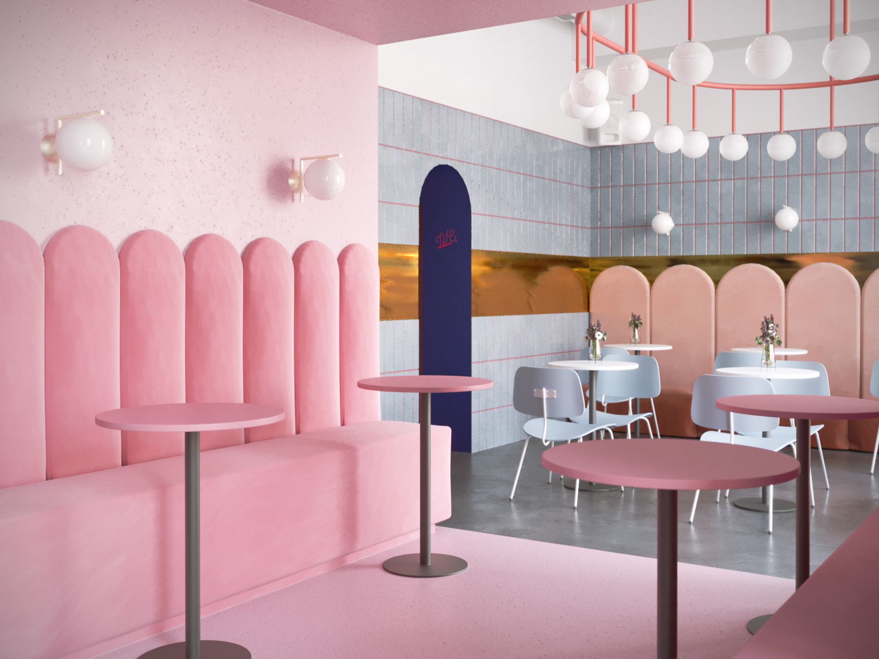 Space is divided into three parts according to their function. A deep-blue take-away zone, a waiting zone which is located in the center of space in a pink box designed specially for this task, and light-grey zone, where you can stay for a croissant with a cup of cappuccino.