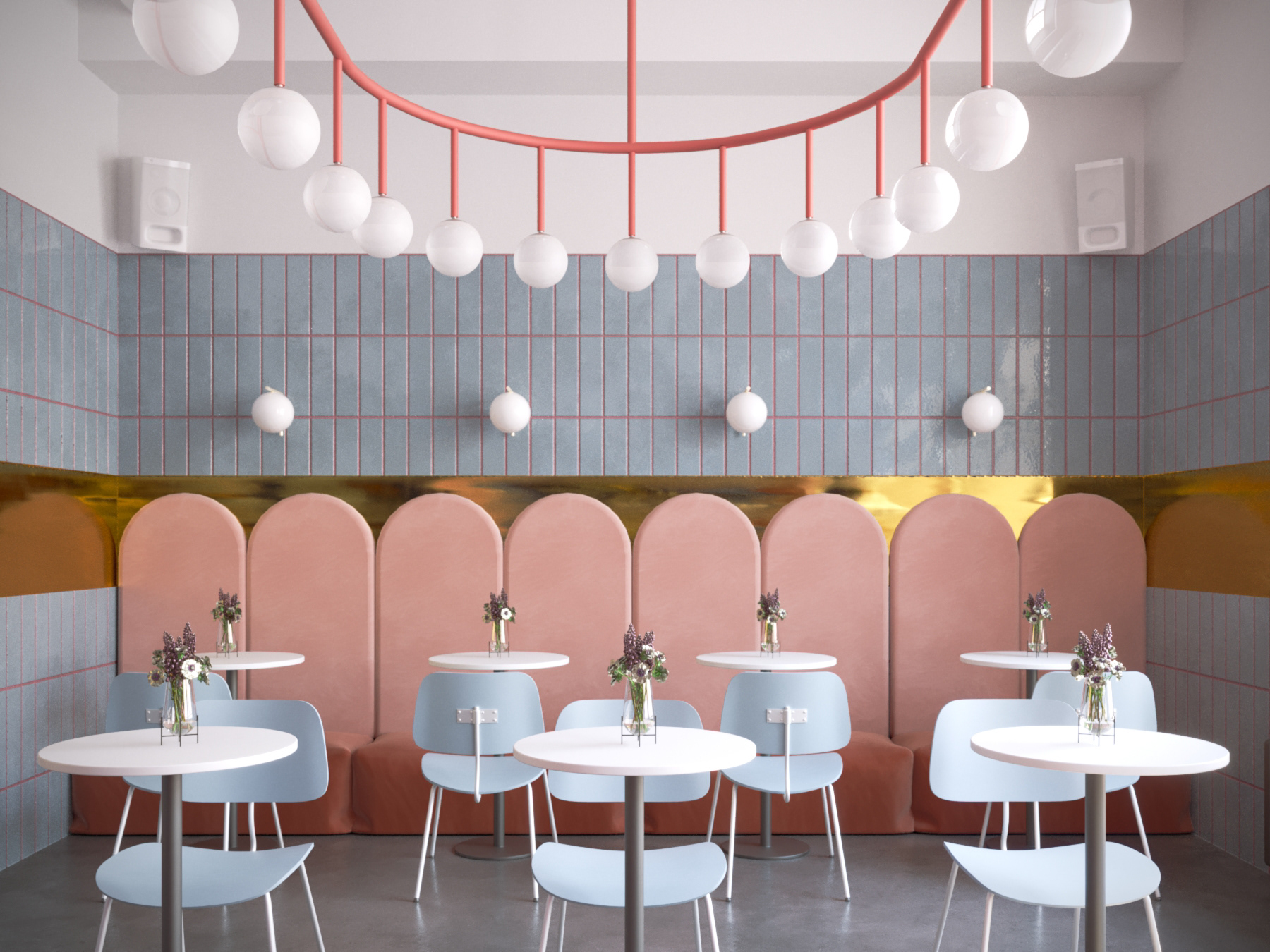 The 85 square meter bakery features high ceilings and large windows. To emphasize the amount of light it was used glossy tiles by Ceramica Bardelli, and to emphasize the height of ceilings, were designed custom-made chandeliers. Built-in furniture, tables, and sofas were also designed specially for this project.