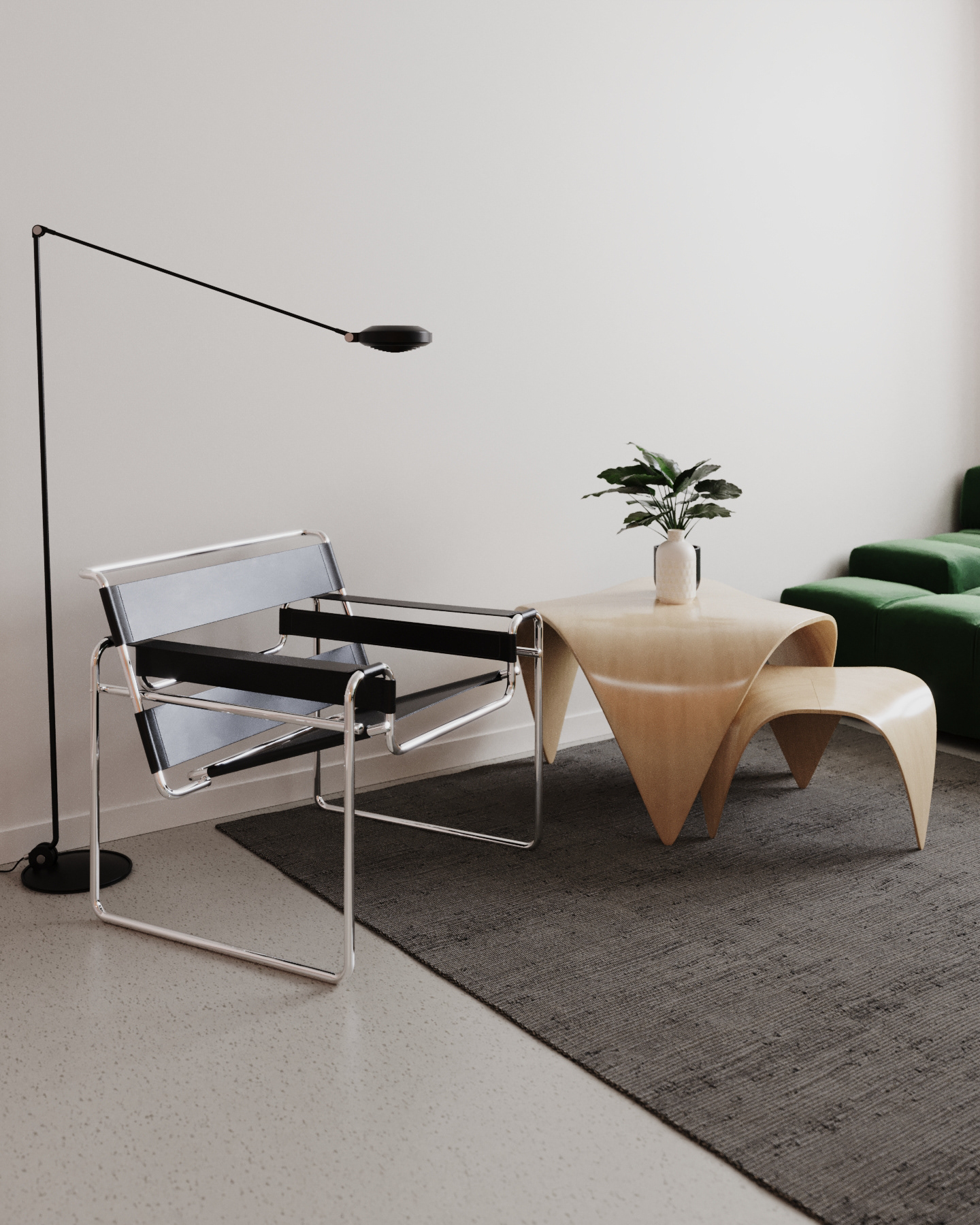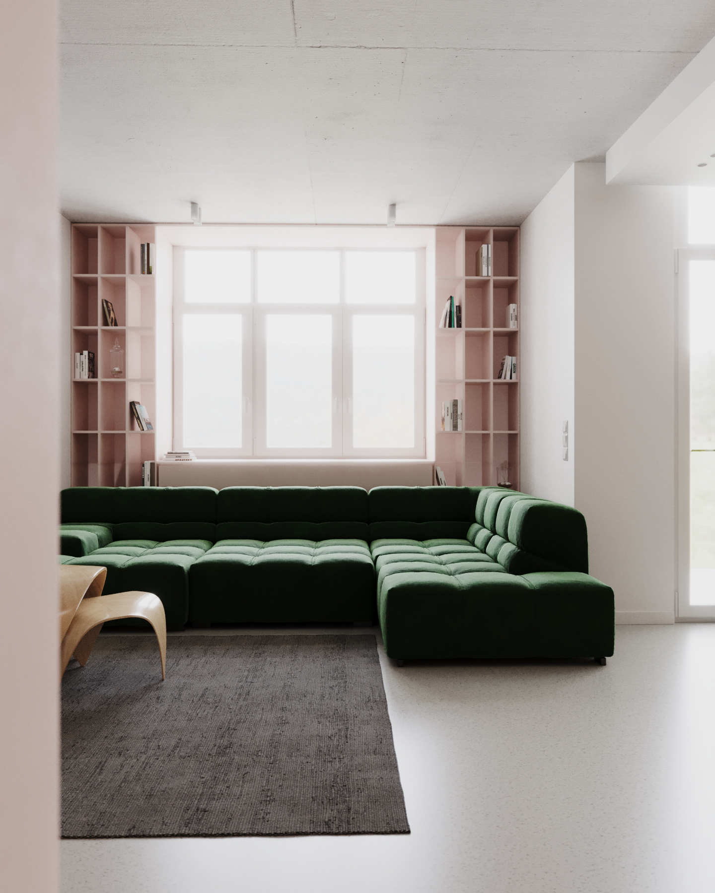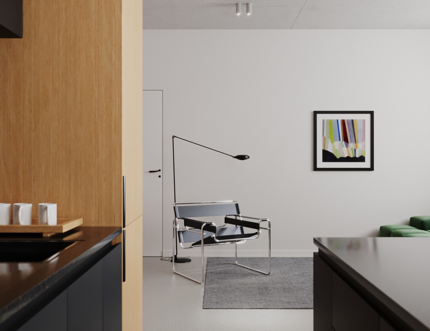 "The main adornment of the living room is the iconic "Wassily" armchair by Marcel Breuer, which has been complemented by a minimalistic floor lamp from the 80s. The deep green modular sofa contrasts the linear carpet's pattern and pink meshed bookshelves"