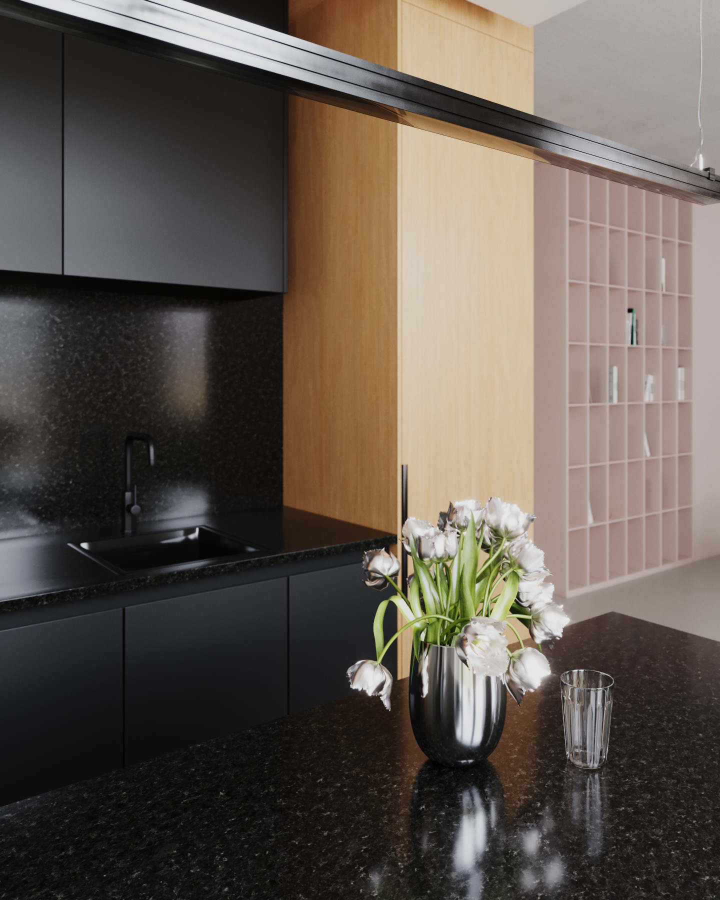 The capacious kitchenette and the kitchen island with semi-bar seating formed the cooking and dining area. This unit is made in black acrylic stone and complemented by veneered elements of built-in cabinets."