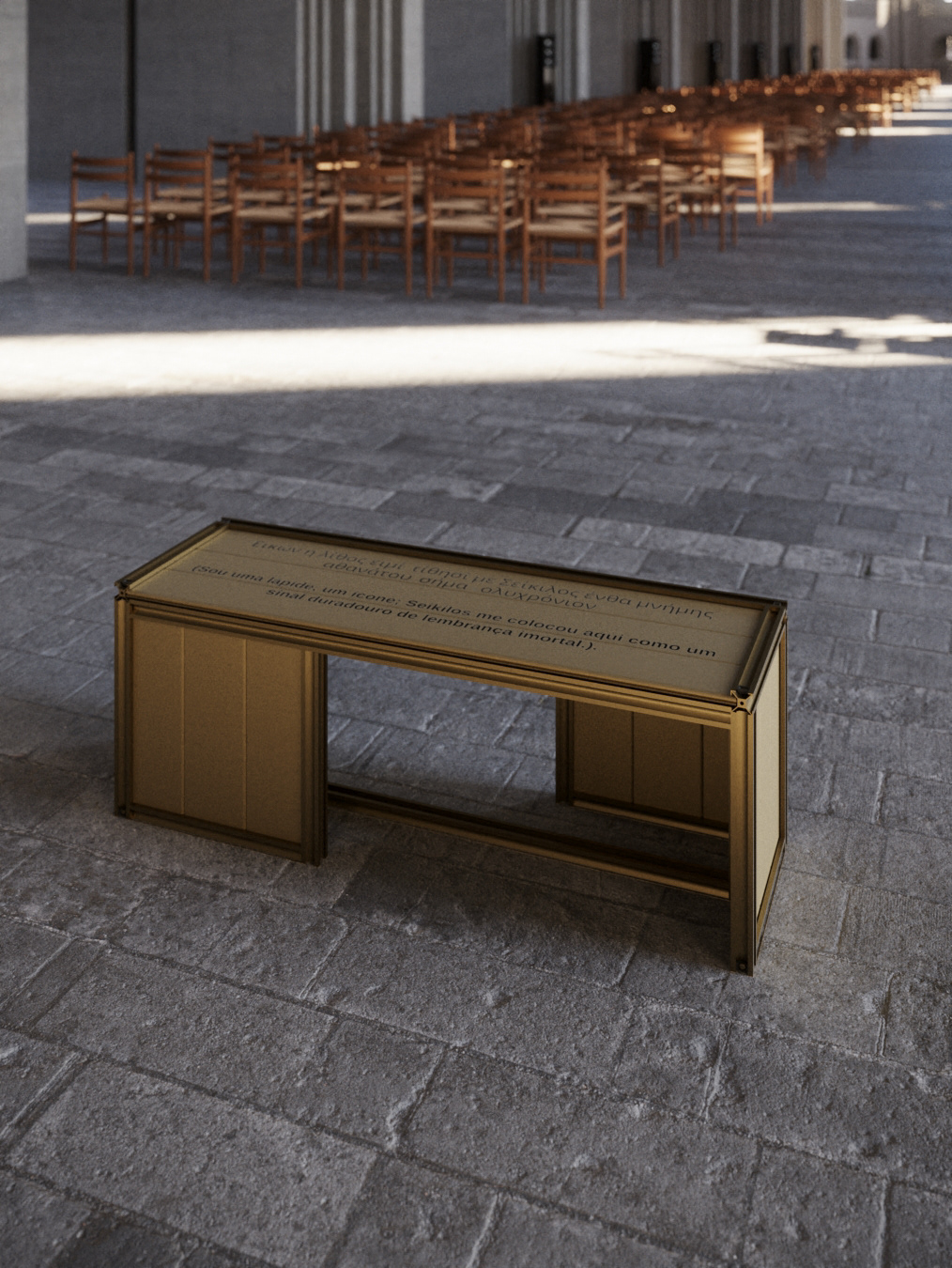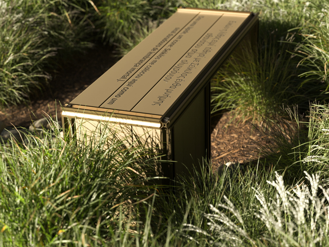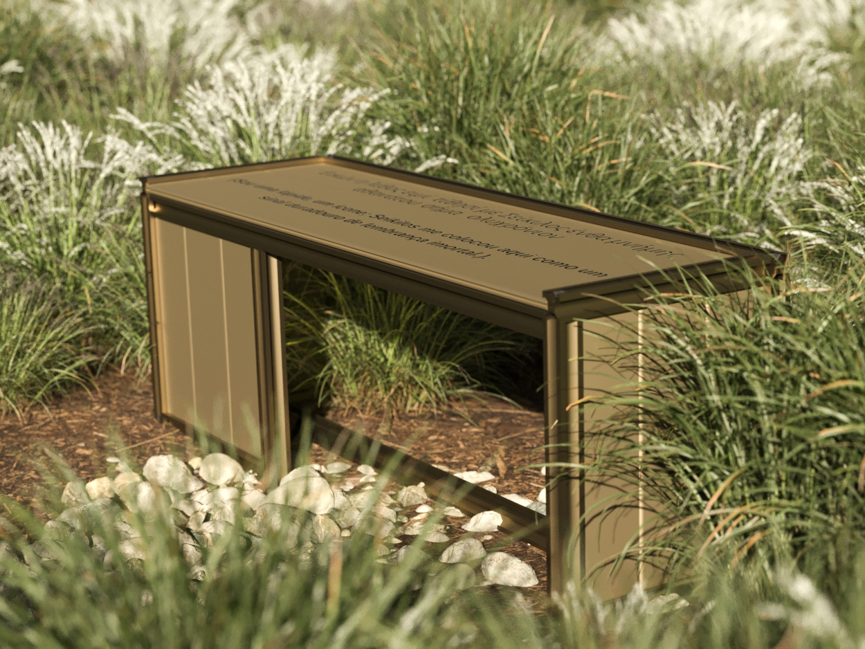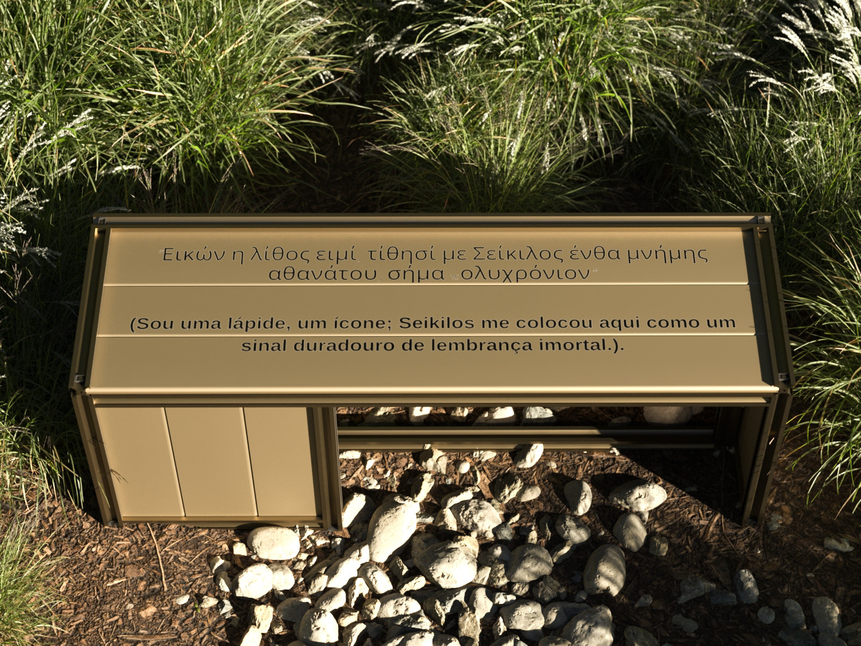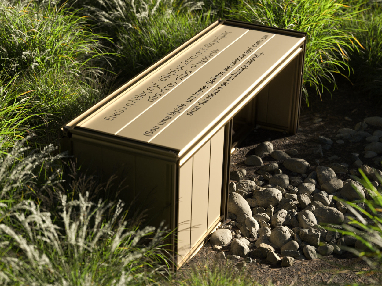 The bench is anodized in bronze and uses duality to create a unique and striking piece. On its surface is a sentence that conveys the whole meaning and concept behind its creation: "I am a tombstone, an icon; Seikilos placed me here as a lasting sign of immortal remembrance." This sentence will be presented both in Portuguese and in ancient Greek, creating a connection with the inspiration of the work.