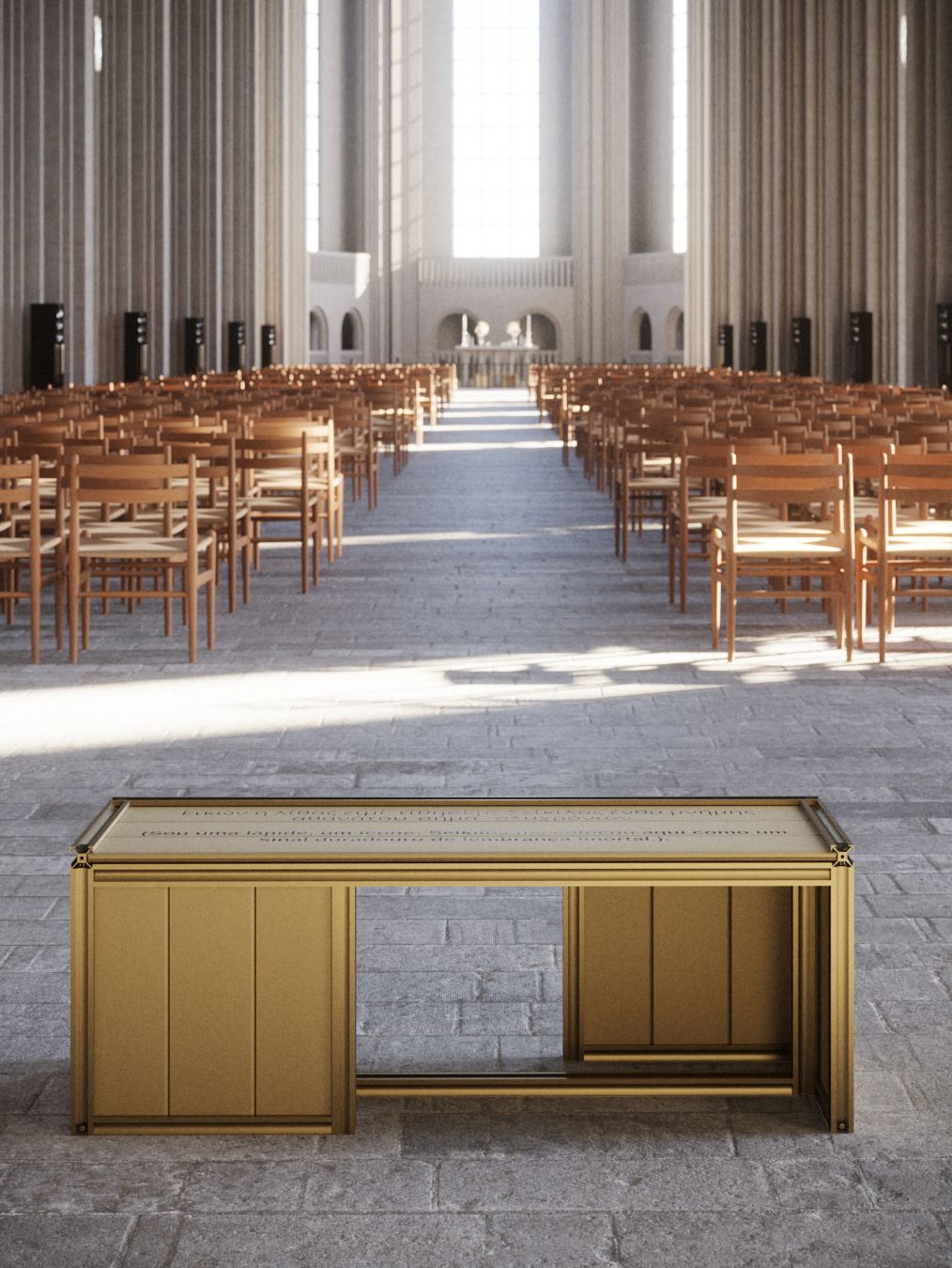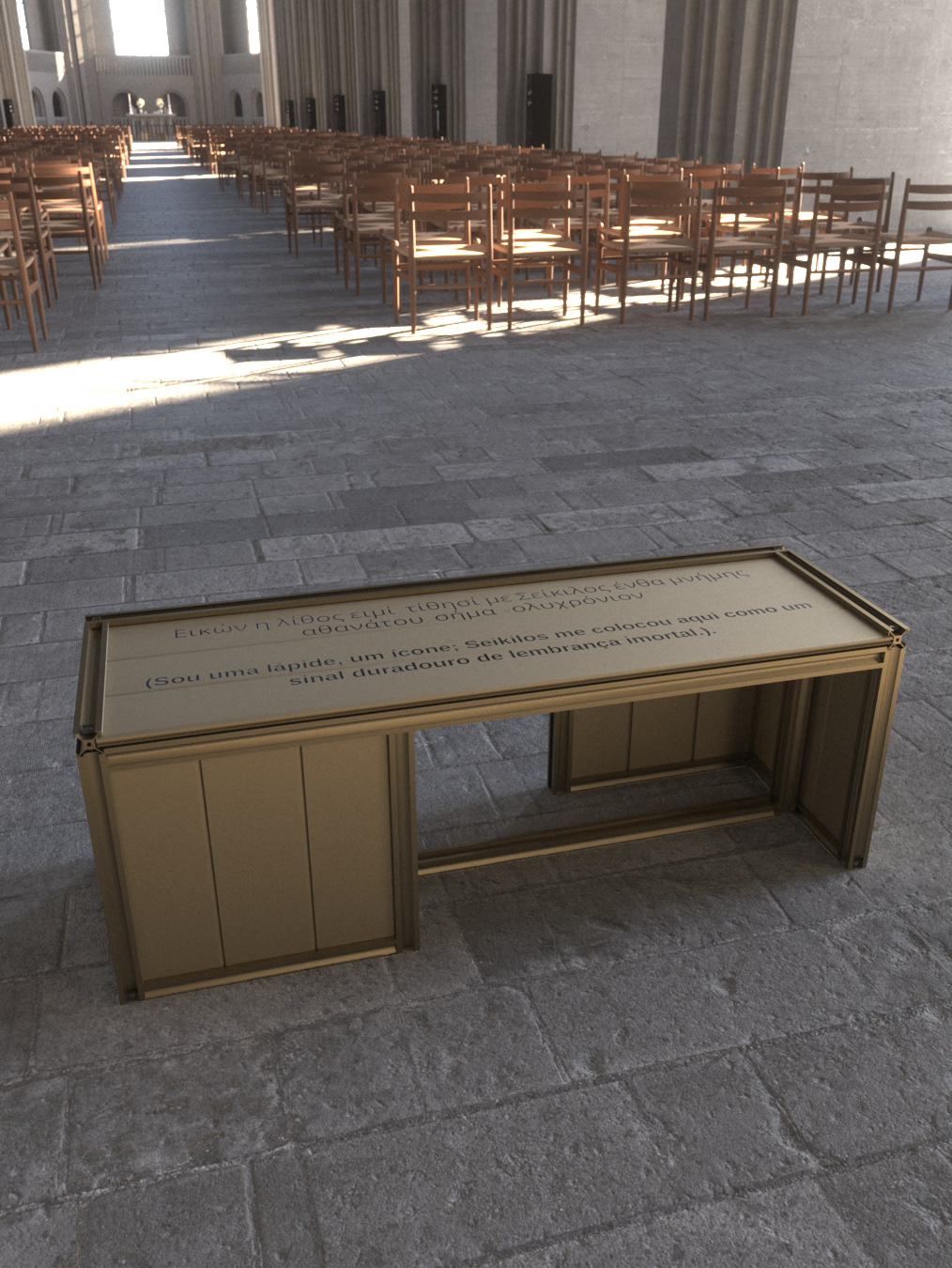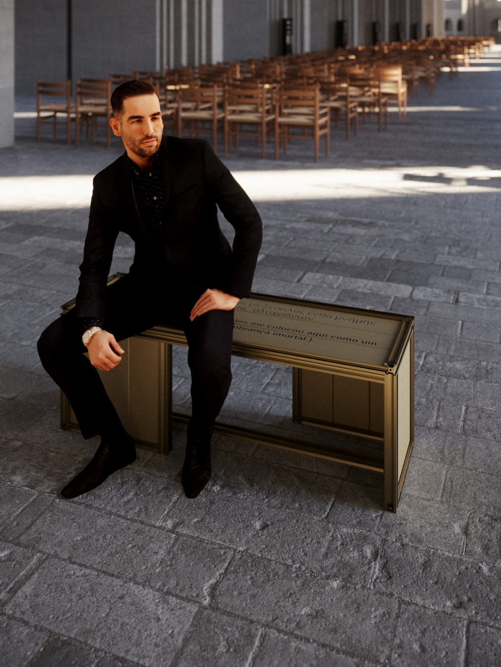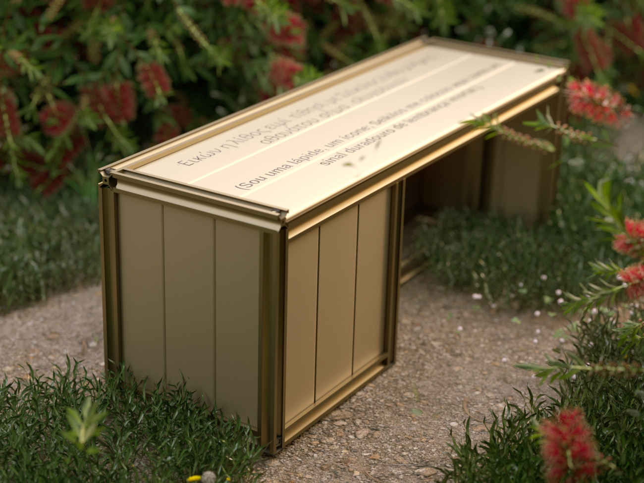 The bench is anodized in bronze and uses duality to create a unique and striking piece. On its surface is a sentence that conveys the whole meaning and concept behind its creation: "I am a tombstone, an icon; Seikilos placed me here as a lasting sign of immortal remembrance." This sentence will be presented both in Portuguese and in ancient Greek, creating a connection with the inspiration of the work.