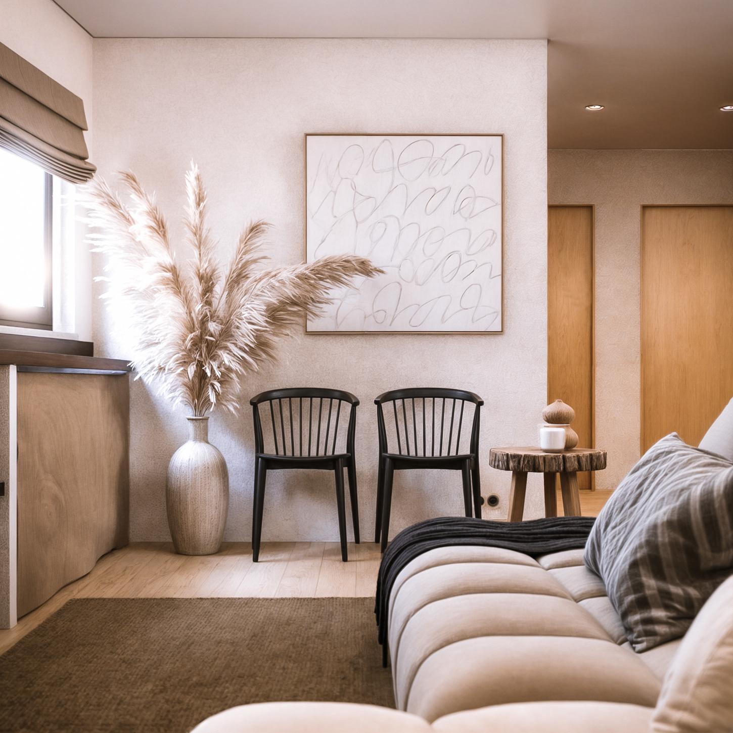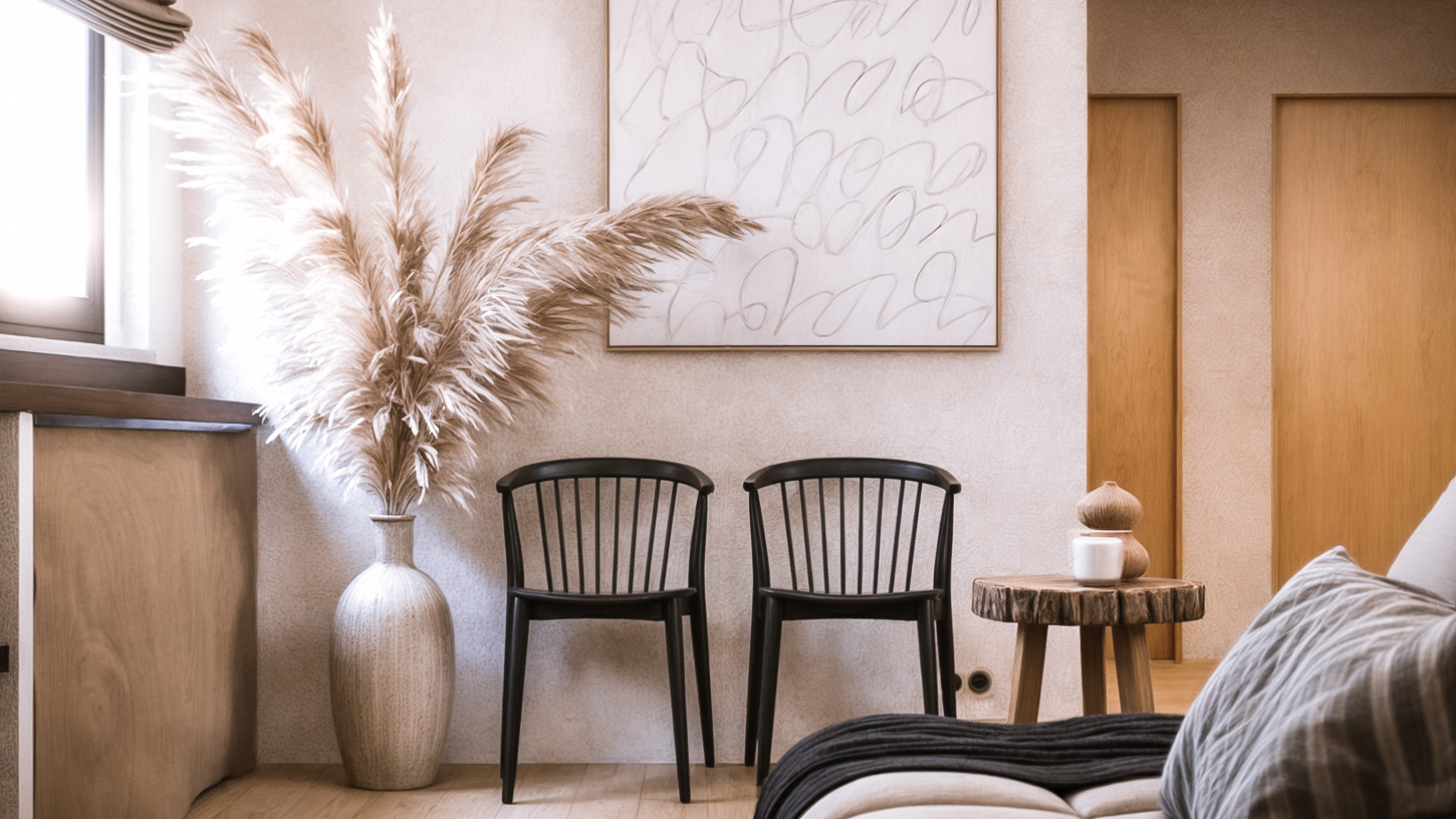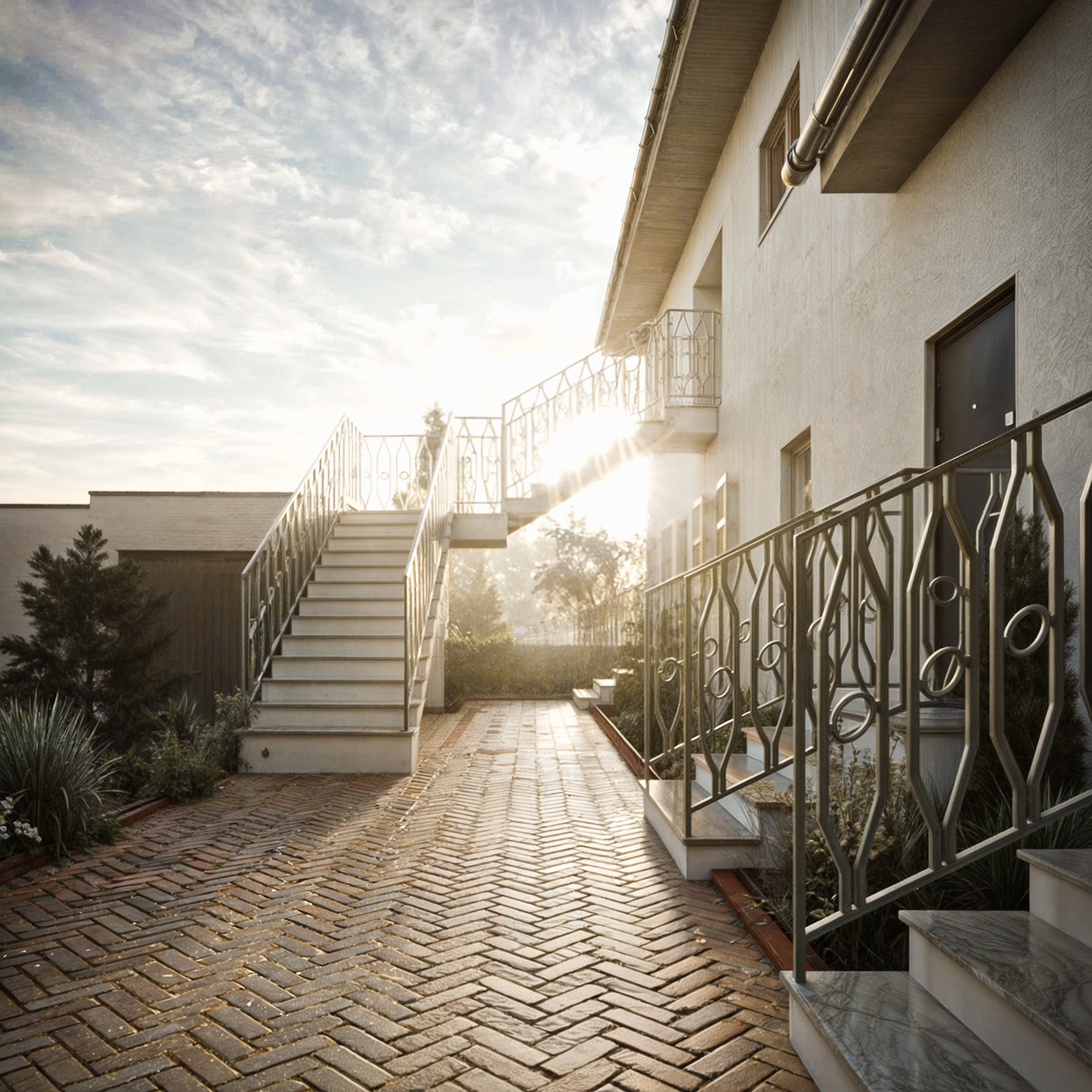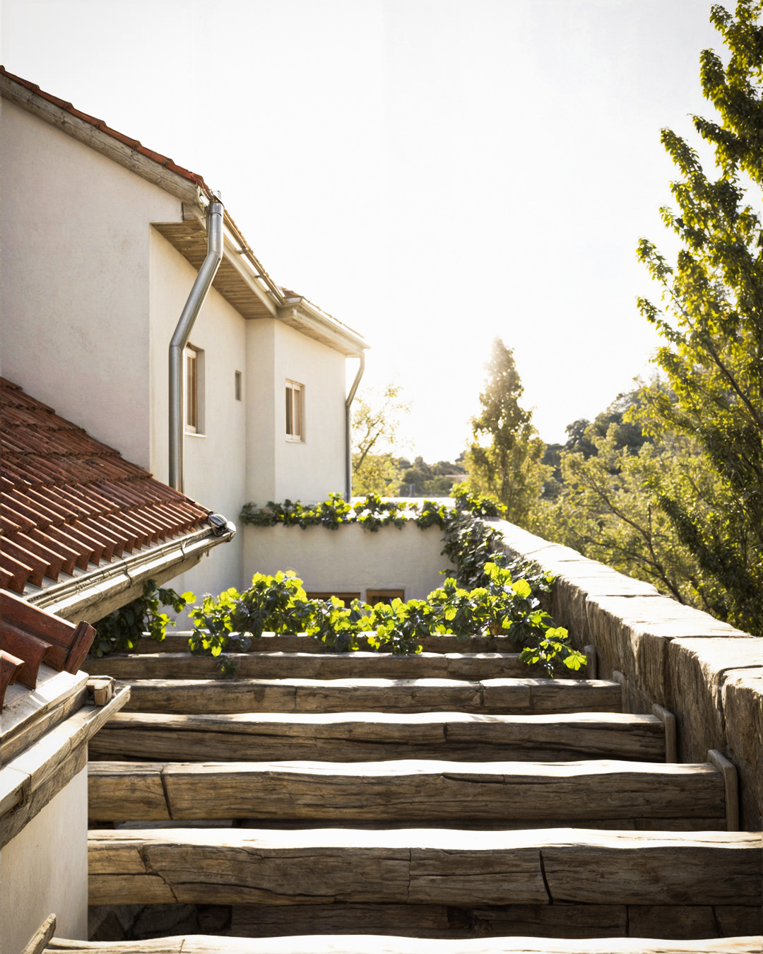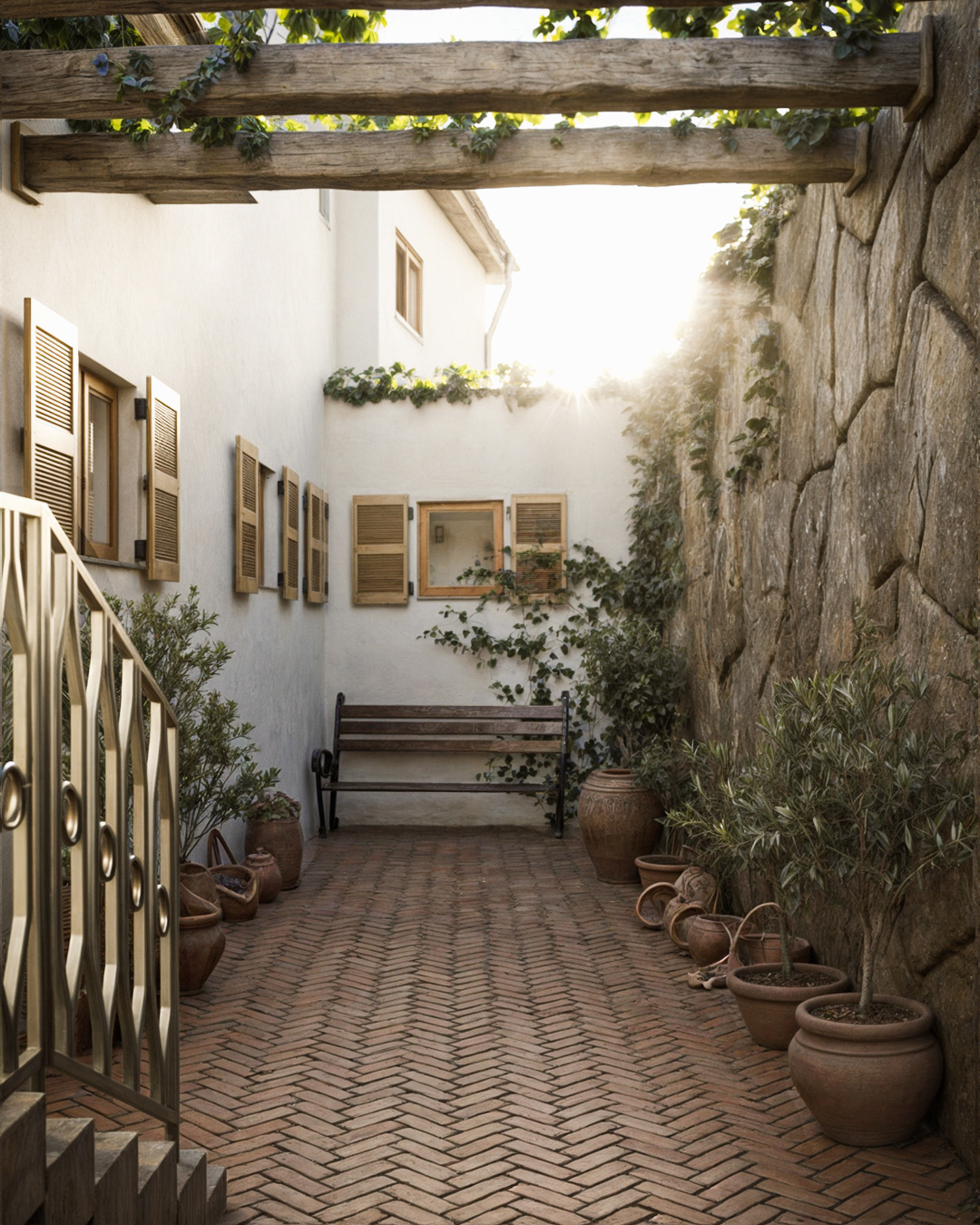 In the image, the herringbone brick path leads the eye through a narrow and welcoming courtyard, surrounded by stone walls and whitewashed walls, typical of Portuguese buildings. The sun gently penetrates through the rustic wooden beams, illuminating the space and highlighting the vibrant green of the vines that embrace the spaces. The clay vases, arranged organically along the passage, recall the ceramic tradition so deeply rooted in the country's villages. The presence of a wooden window with shutters reinforces the connection with the place, while an iron and wood bench evokes an invitation to enjoy the simplicity of the moment.